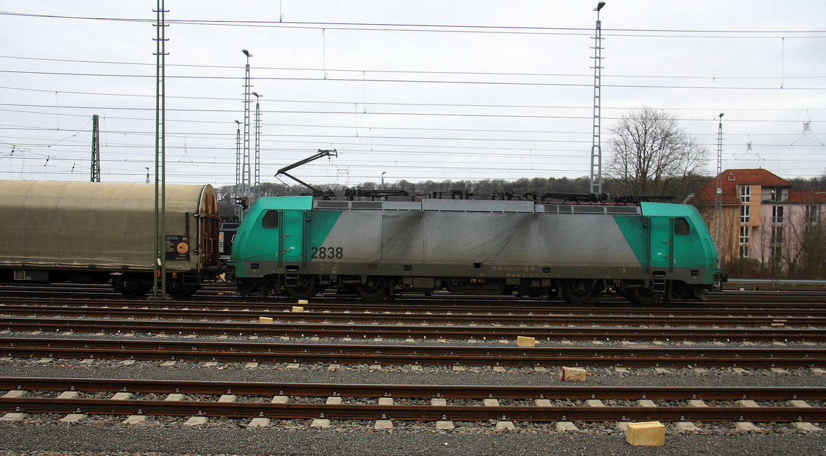 Die Cobra 2838 fährt mit einem Güterzug aus Antwerpen-Noord(B) nach Köln-Gremberg bei der Ausfahrt aus Aachen-West und fährt in Richtung Aachen-Schanz,Aachen-Hbf,Aachen-Rothe-Erde,Stolberg-Hbf(Rheinland)Eschweiler-Hbf,Langerwehe,Düren,Merzenich,Buir,Horrem,Kerpen-Köln-Ehrenfeld,Köln-West,Köln-Süd. Aufgenommen vom Bahnsteig in Aachen-West. Bei Wolken am Kalten Nachmittag vom 12.1.2017.
