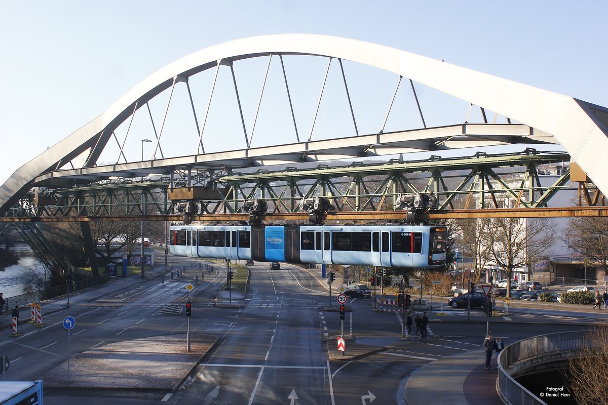 Die neue Schwebebahn GN04 am Döppersberg in Wuppertal, am 22.01.2017.