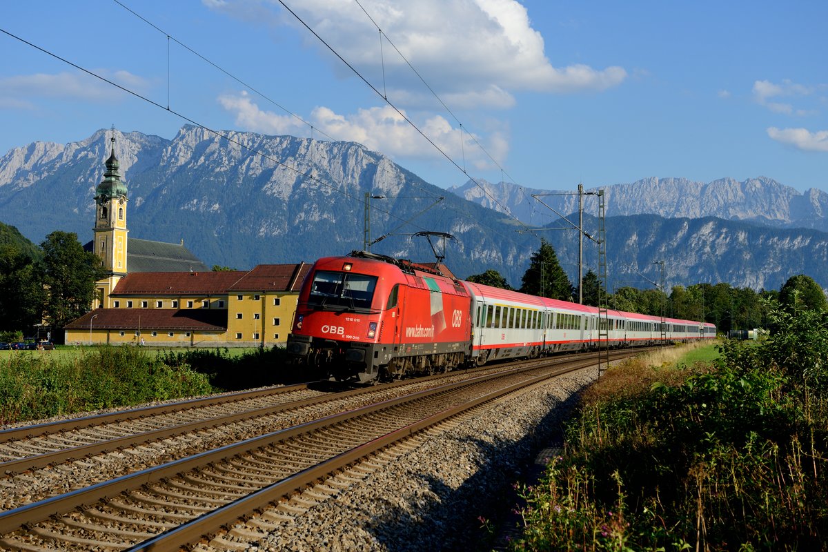 Ein idyllisches Bild - 1216.016 passiert am 22. August 2015 mit ihrem EC 84 das Kloster Reisach bei Niederaudorf. Im Hintergrund die eindrucksvolle Bergkulisse von Zahmen und Wildem Kaiser. Und doch gibt es einen Bezug zum Weltgeschehen und gesellschaftlichen Herausforderungen. Aktuell werden die EuroCities zwischen Italien und Deutschland von zahlreichen Flüchtlingen und Asylsuchenden genutzt, die auf ein besseres Leben hoffen. Oft sind die Züge verspätet, der Grund lautet zumeist "polizeiliche Ermittlungen"....