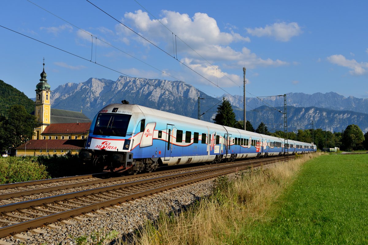 Kommt der RailJet Steuerwagen voraus, bleibt die Kamera aus. Eine Ausnahme machte ich am 22. August 2015, denn der RJ 661 von Bregenz nach Wien Westbahnhof lag beim Kloster Reisach schön im warmen Abendlicht. Und die Werbefolierung für Österreichs Skigebiete ist auch durchaus nicht unattraktiv....