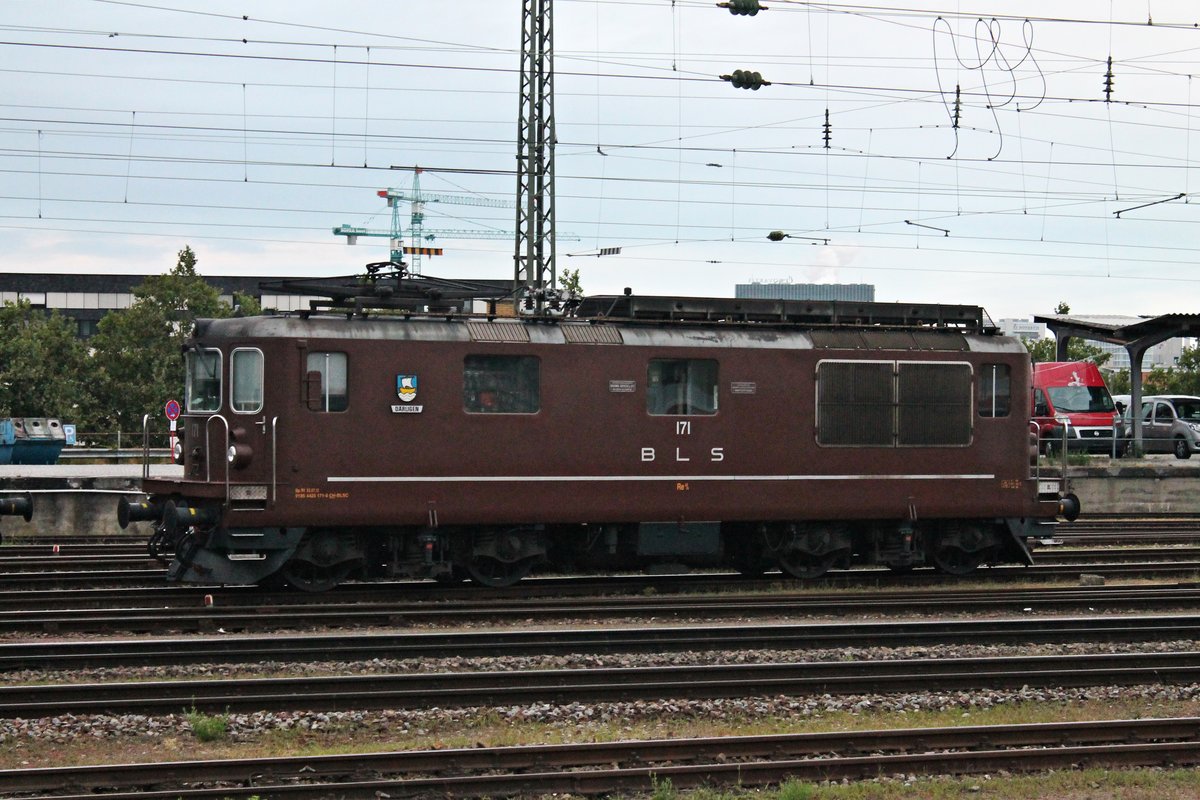 Lokportrait von Re 4/4 171 (425 171-6)  Därligen , als sie am Morgen des 29.07.2015 zusammen mit weiteren Loks von BLS Cargo in Basel Bad Bf abgestellt stand und auf ihren nächsten Einsatz wartete.