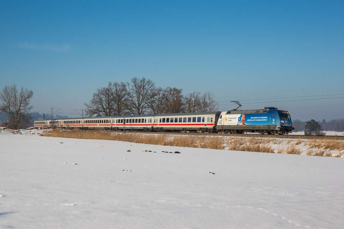 Die DB 218 434-9 fährt am Morgen des 28.1.2017 mit dem IC 2084 "Nebelhorn" von Oberstdorf nach Hamburg-Altona in Stein vorüber.