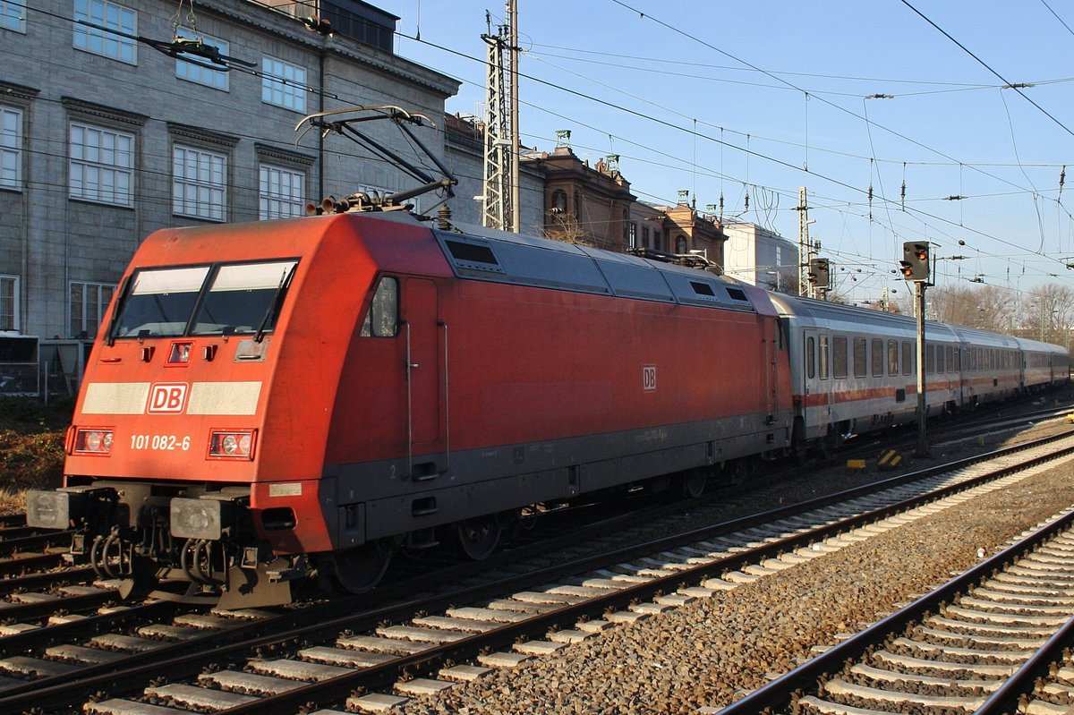 DB Lok 101 134-5 fährt beim Badischen Bahnhof ein. Das abzweigende Gleis führt auf einen Parkplatz, von wo aus auch diese Aufnahme am 18.01.2017 entstand.