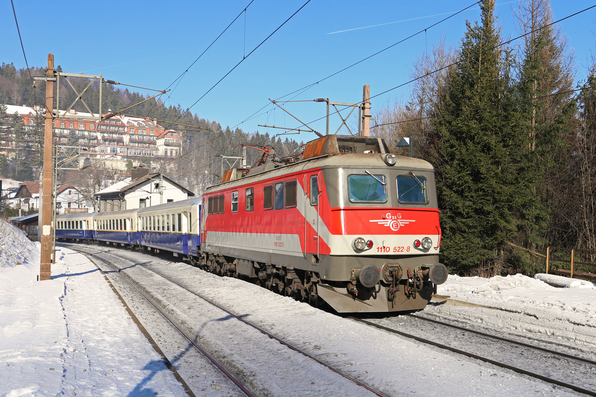 1142.698+1144.108 fahren mit G-55501 zwischen Breitenstein und Wolfsbergkogel kurz vor dem Adlitzgraben-Viadukt am 28.1.17 bergwärts.