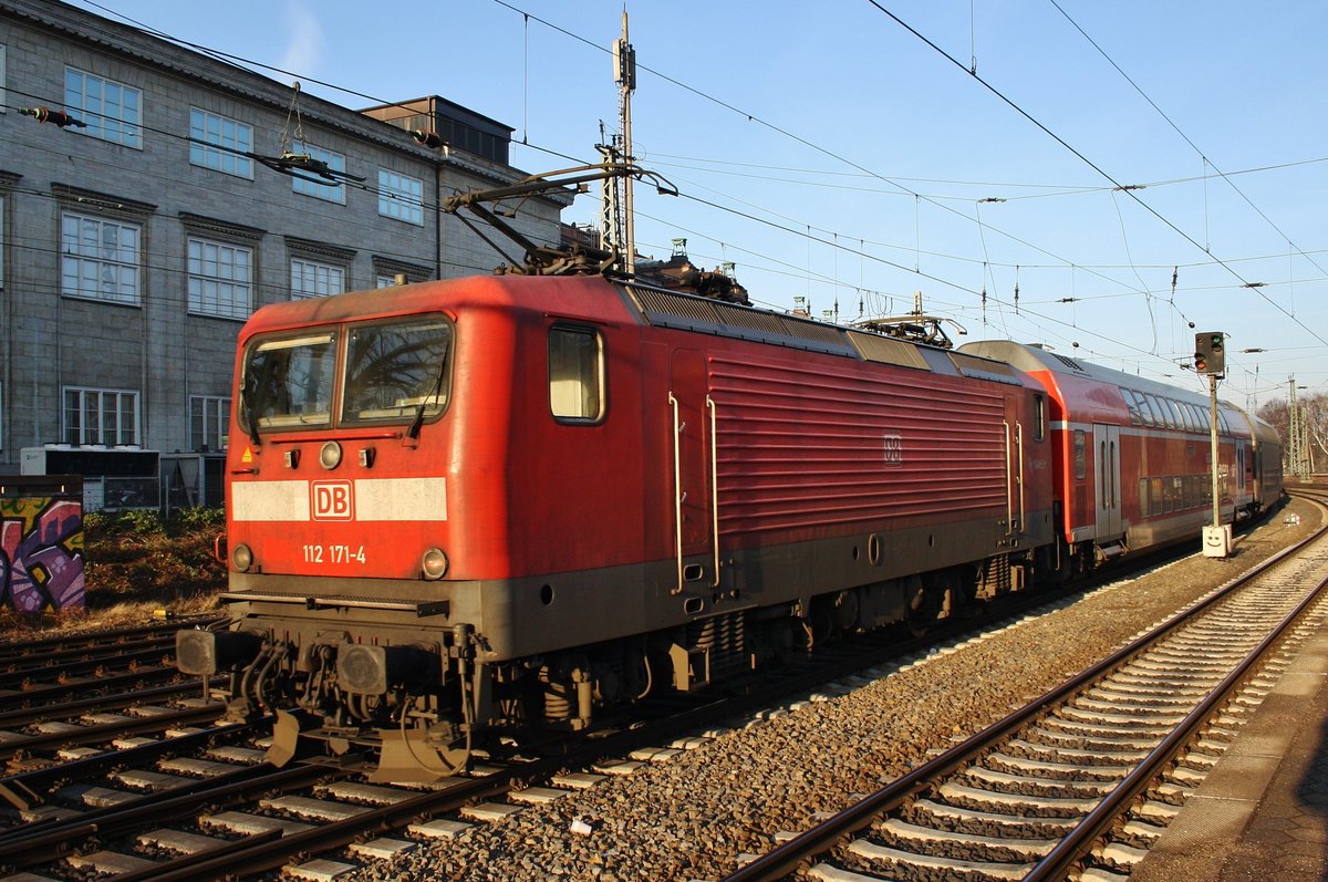 Mit einer Reihe X-Wagen ist die 111 150-9 bei der Ausfahrt aus Dortmund-Oespel. Dennis Fiedler ist hier hockend am Bahnsteigende zu sehen, wie er den Zug im Nachschuß macht. Die Züge übernehmen zwischen Bochum Hbf und Dortmund Hbf die Leistungen der 422, die Tunnelverbot haben bis der Brandschutz in den Zügen gewährleistet ist. 28.1.2017