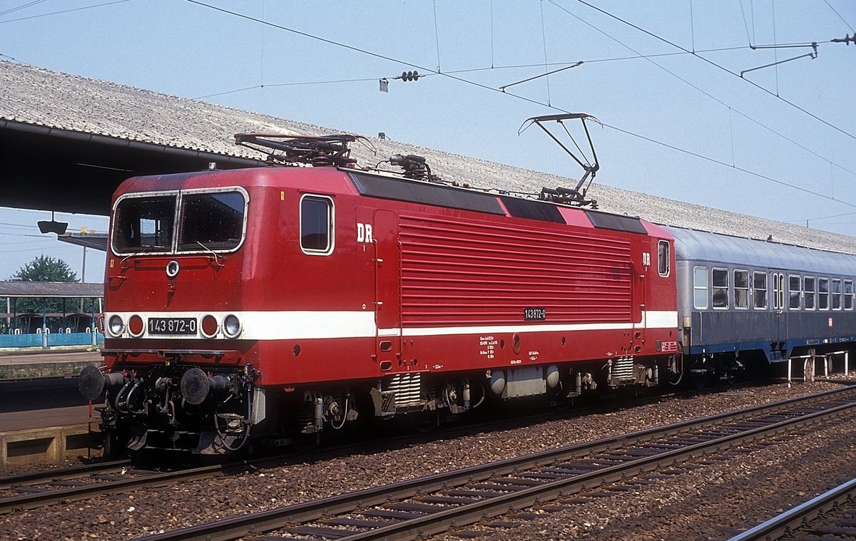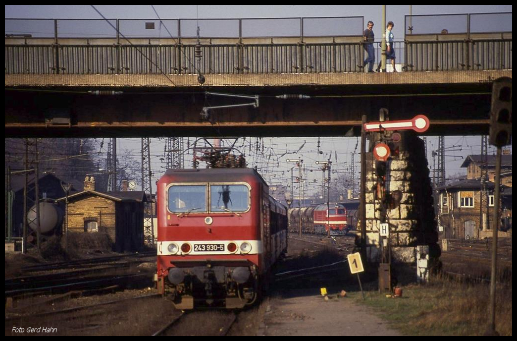 243930 fährt am 18.3.1990 mit einem Personenzug in den Bahnhof Dessau ein.