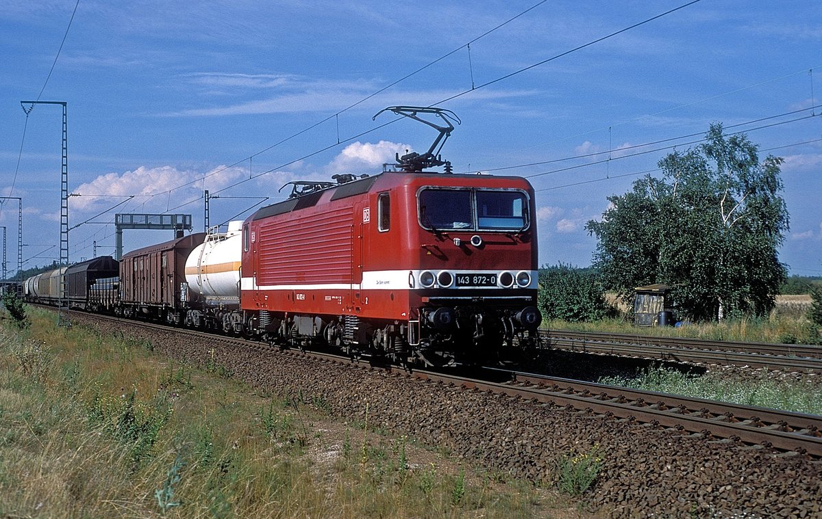 120141 wartet im Güterbereich des Bahnhof Dessau am 18.3.1990 vor einem Güterzug auf die Weiterfahrt.