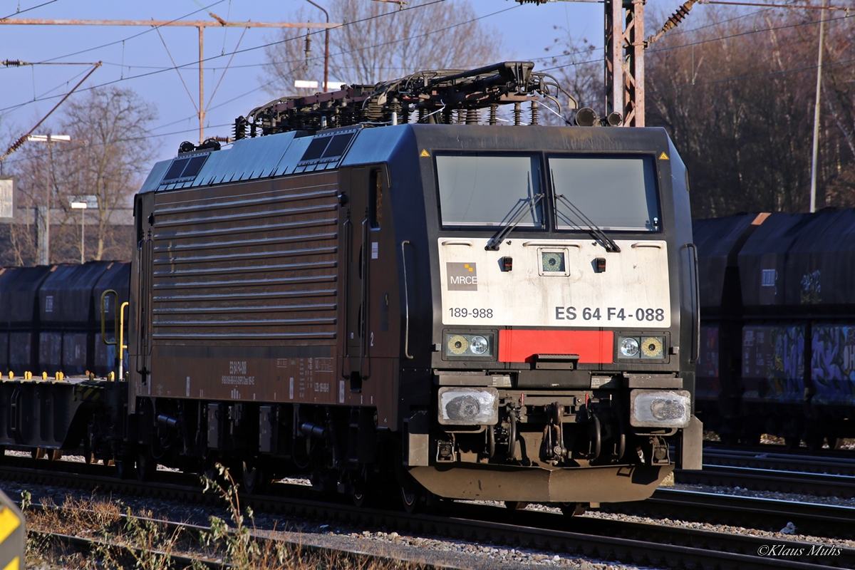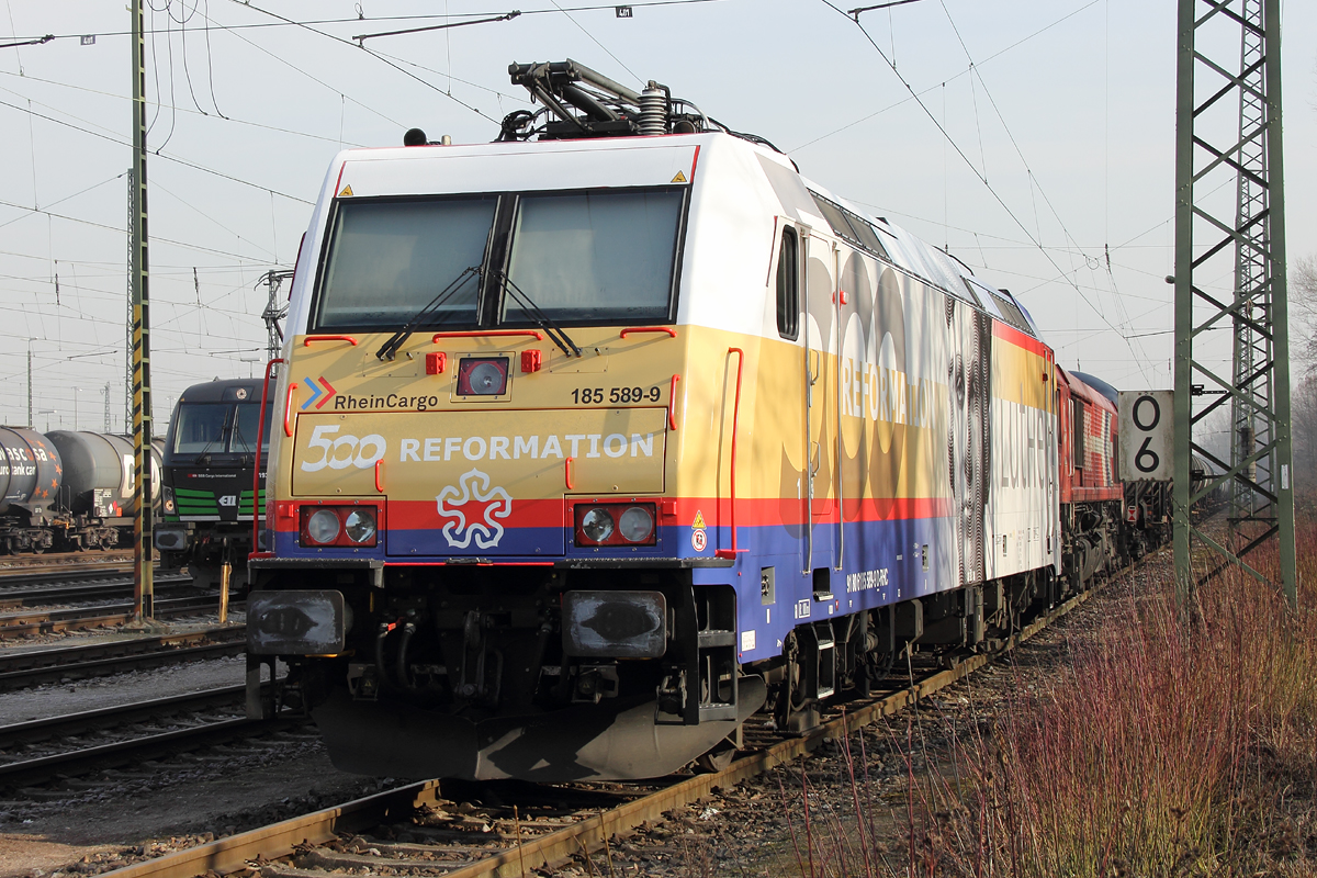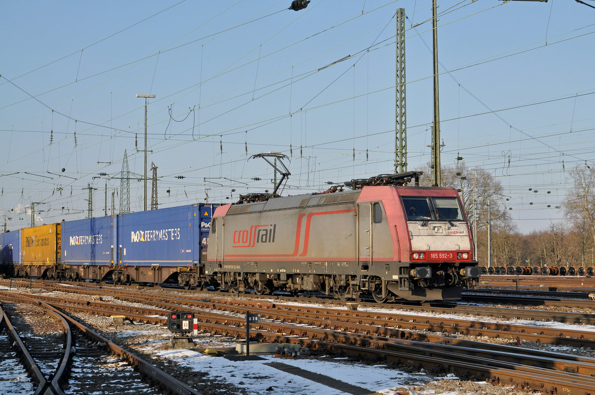 Lok 185 592-3 durchfährt den Badischen Bahnhof. Das abzweigende Gleis führt auf einen Parkplatz, von wo aus auch diese Aufnahme am 18.01.2017 entstand.