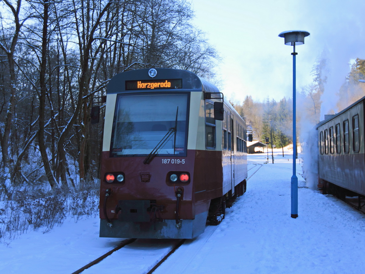 187 019-5 der Harzer Schmalspurbahnen nach Harzgerode steht am 22. Januar 2017 im Bahnhof Alexisbad.