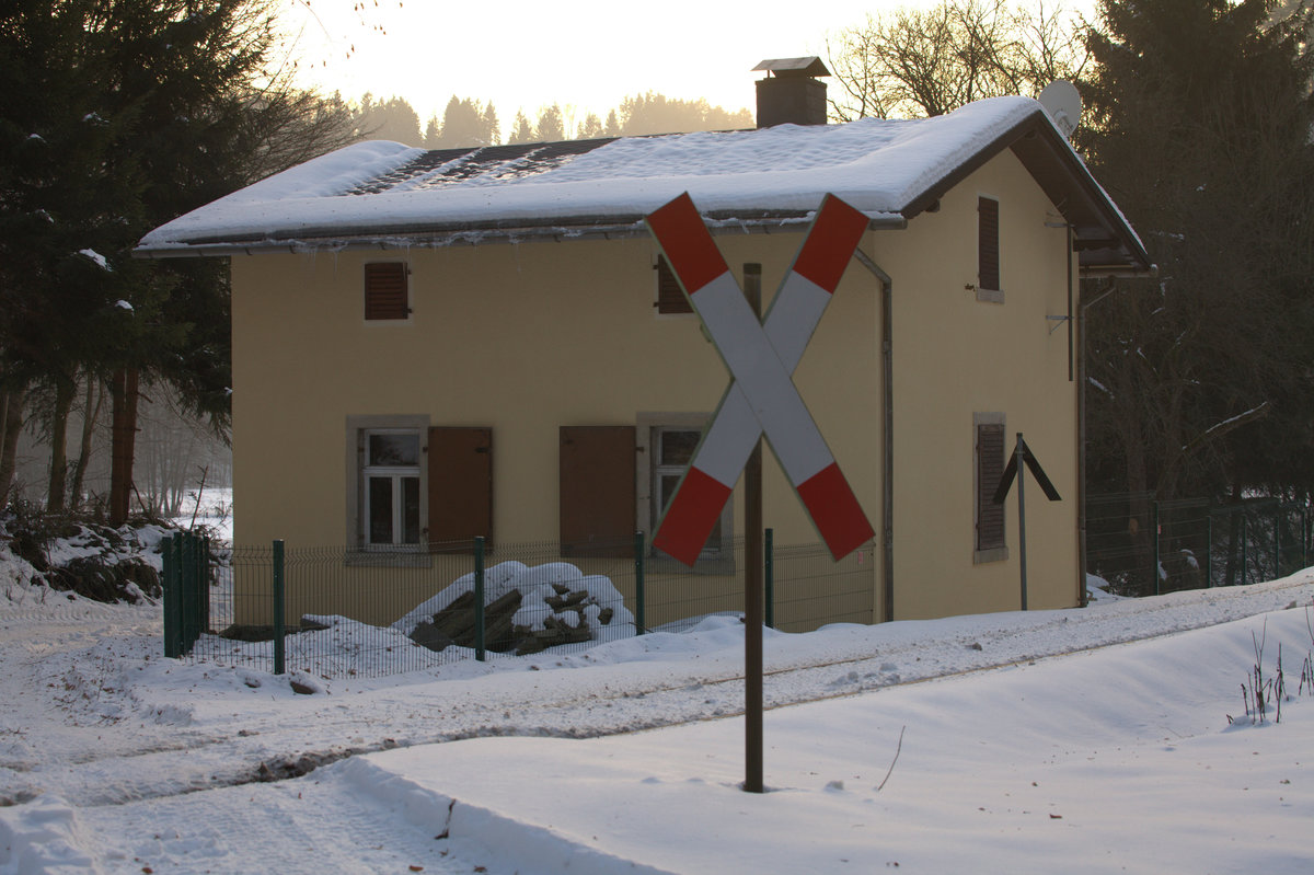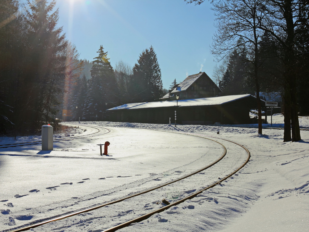 Alexisbad am 22. Januar 2017, Aus- bzw. Einfahrgleise von Alexisbad nach Harzgerode und Hasselfelde bei Sonnenschein und Schnee.