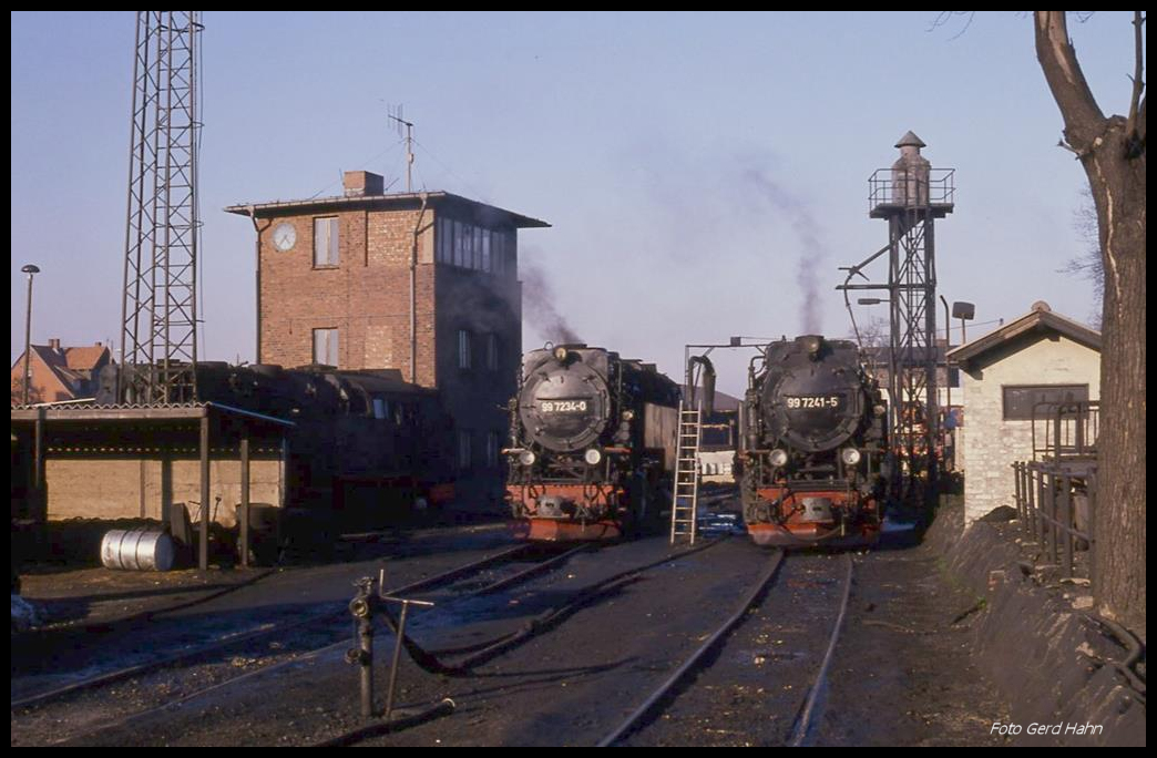 Blick in das Schmalspur BW in Wernigerode am 17.3.1990: Unter Dampf warten links 997234 und daneben 997241 auf ihre nächsten Einsätze.