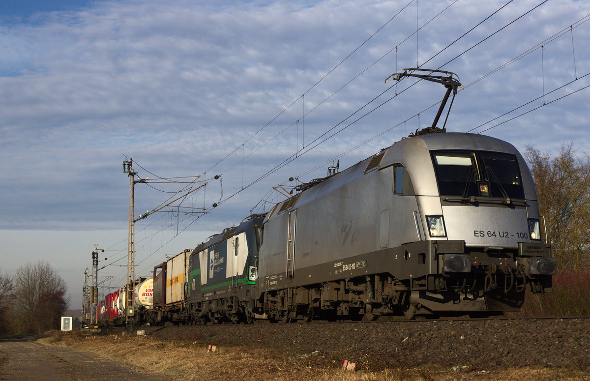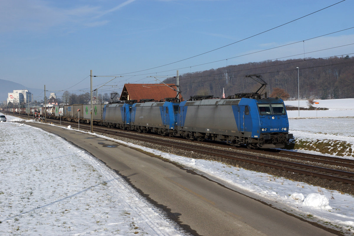 Bereits einige Kilometer weiter als auf dem Bild von Walter Ruetsch (ID 992250) befindet sich die 187 003 mit der Re 4/4 185 im Schlepp am 28. Januar 2017 bei Kiesen.