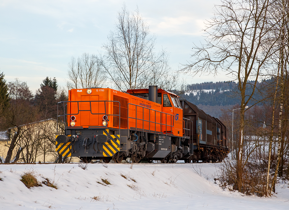 Die frisch revidierte Lok 42 (92 80 1277 902-3 D-KSW) der Kreisbahn Siegen-Wittgenstein (KSW), eine Vossloh MaK G 1700 BB, am 27.01.2017 mit einem beladenen Coil-Güterzug (Teleskophaubenwagen der Gattung Shimmns 2) in Neunkirchen-Salchendorf kurz vor dem Bü Wildener Str., hier geht es gleich in der Steilstrecke und der Spitzkehre zum Pfannenberg hinauf.