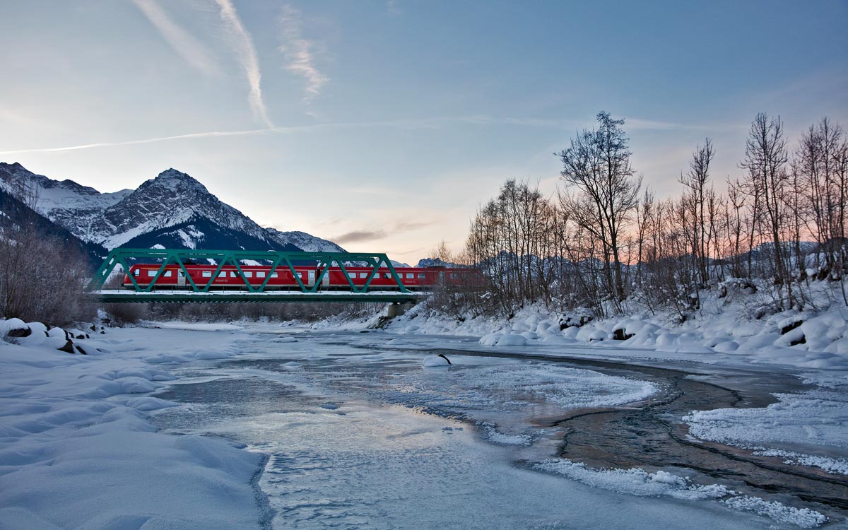RE 3385 von Oberstdorf fährt am bitterkalten Morgen des 28.1.2017 in Fischen nach Augsburg Hbf über den beinahe zugefroren Fluss Iller.