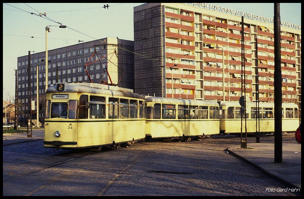 Tram Wagen 34 der Linie 2 erreicht hier am 18.3.1990 den HBF Dessau.