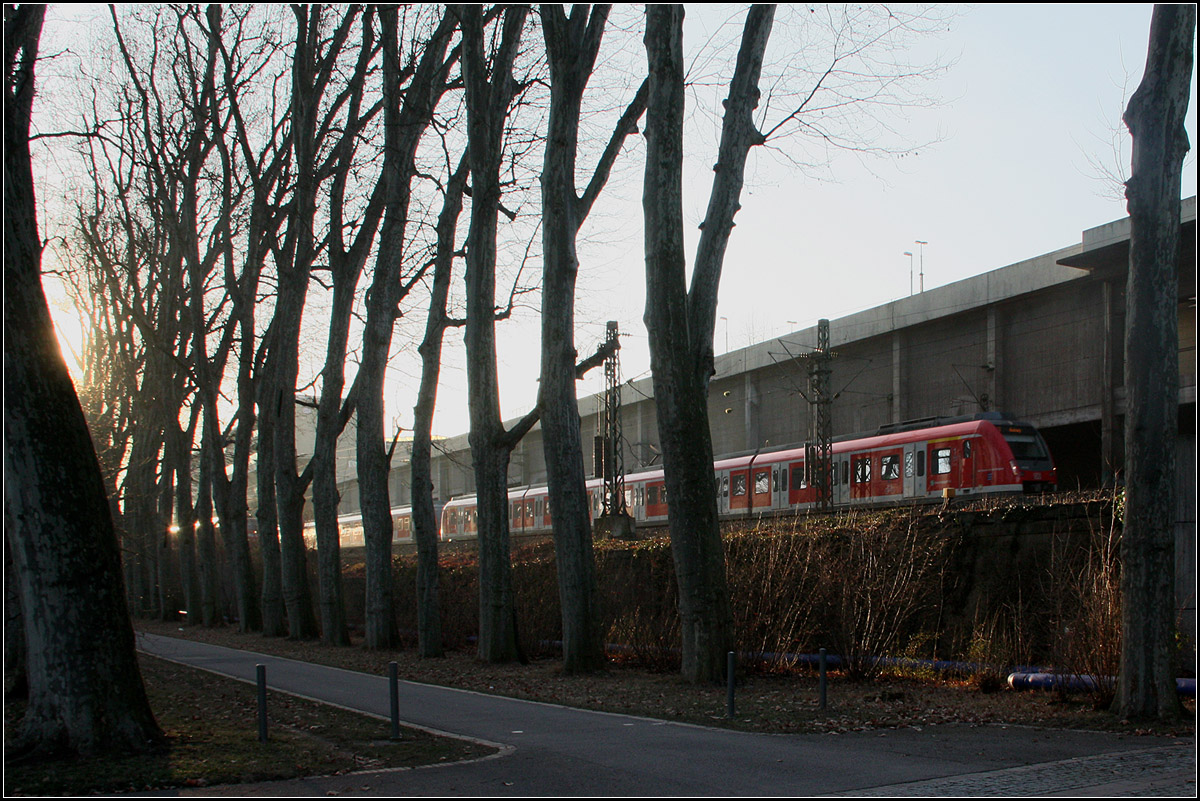 Im Gegenlicht - Eine S-Bahn der Baureihe 430 der Linie S2 Fahrtrichtung Schorndorf auf der viergleisigen Bahnstrecke zwischen Stuttgart Hbf und Stuttgart-Bad Cannstatt. Die Strecke verläuft parallel zum Stuttgarter Schlossgarten. Nach Fertigstellung von Stuttgart 21 wird die Trasse zum Großteil der Parkerweiterung dienen. Die vier Gleise werden im Linienbetrieb betrieben. Links die zwei Gleise für Fern- und Regionalverkehr, rechts die beiden Gleise für die S-Bahn, auf denen aber ebenfalls Züge des Regionalverkehres fahren. 27.01.2017 (M)