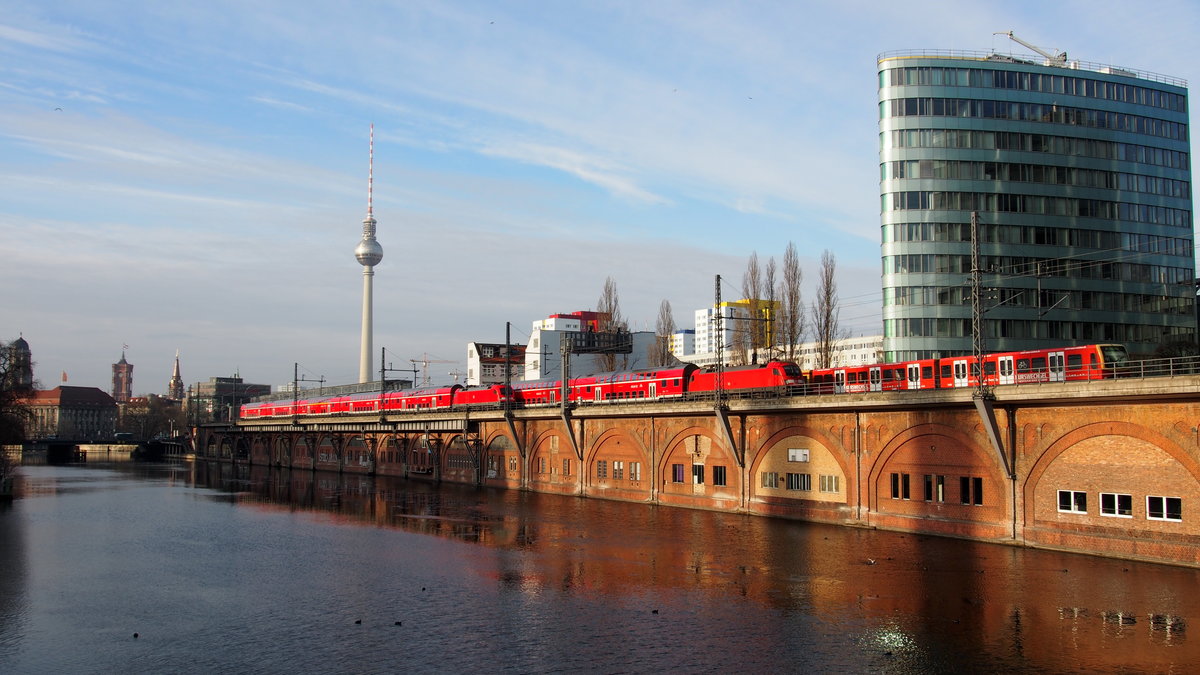 Ein RE1 wartet in Höhe des S-Bahnhofes Jannowitzbrücke auf die Einfahrt in den Berliner Ostbahnhof.