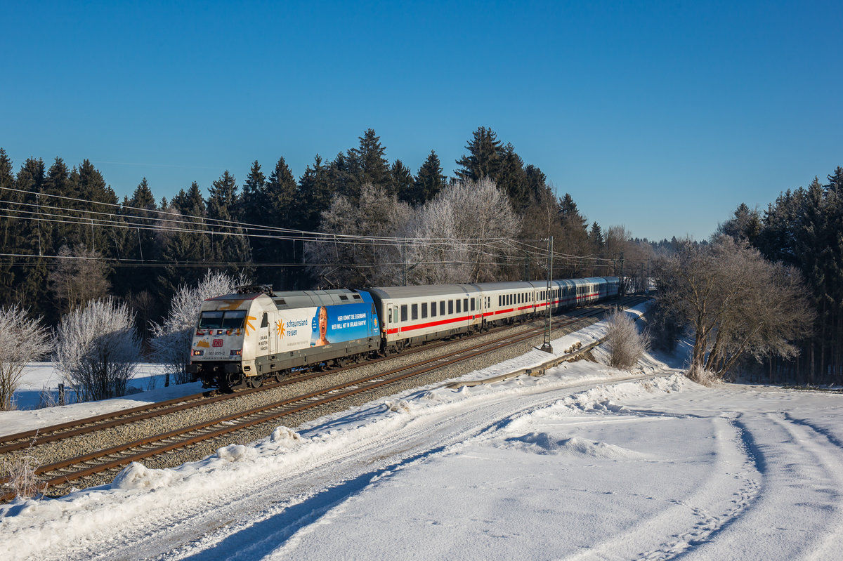 Die 101 055-2 der DB "Schauinsland Reisen" zieht den IC 2082 "Königsee" am 28.01.17 bei Weisham in der Nähe von Prien am Chiemsee.