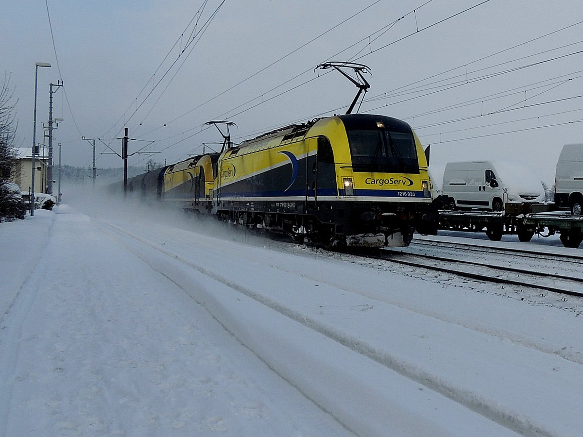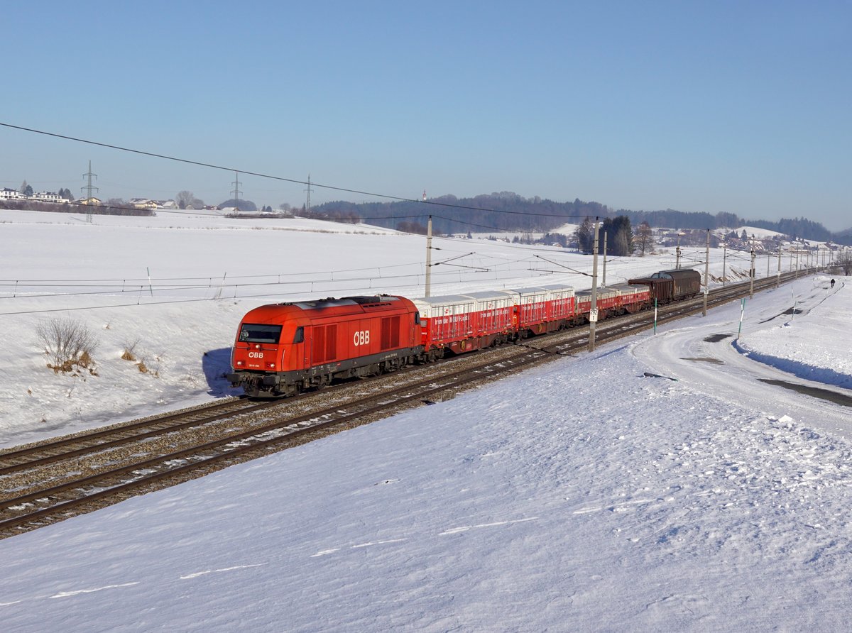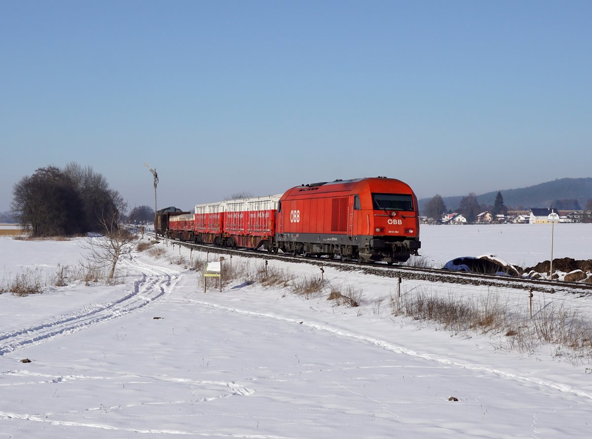 Die 2016 064 mit einem Güterzug am 27.01.2017 unterwegs bei Munderfing.