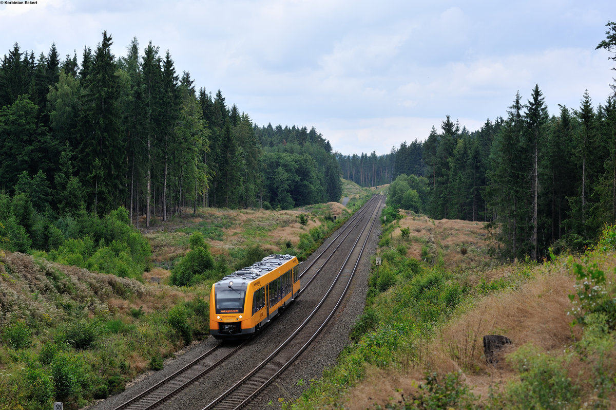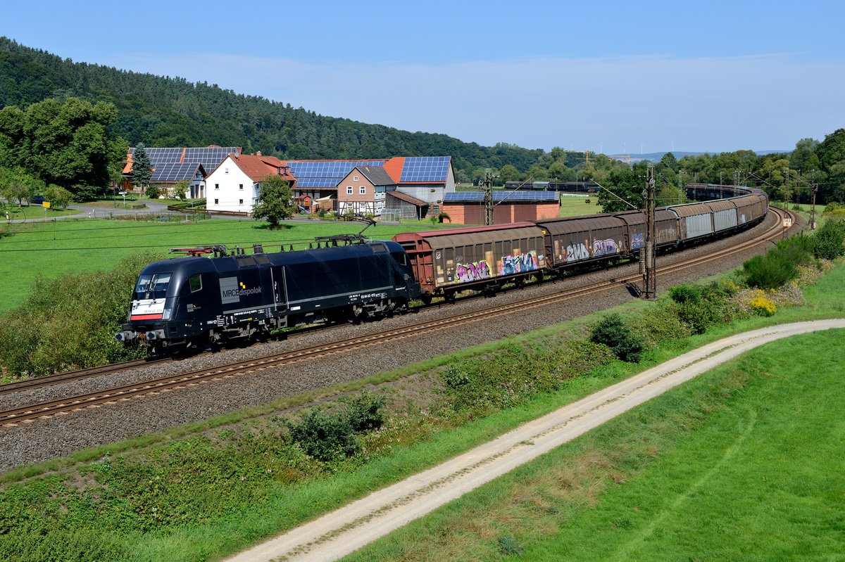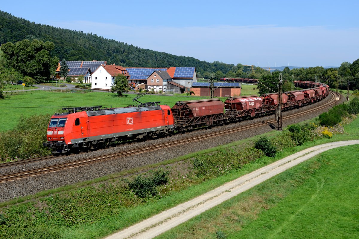 Von Zugdichte und Fahrzeugvielfalt hatte ich mir auf der Nord-Süd-Strecke mehr erwartet. Am 30. August 2015 fuhr mir aber wenigstens dieser interessante Güterzug bei Hermannspiegel vor die Linse: Komplett aus Waggons der Gattung Taoos-y 894 gebildet, wurde er von der 185 148 gezogen, während am Zugschluss 185 217 Schubunterstützung leistete. Damit habe ich in Mitteldeutschland eher weniger gerechnet, kennt man solche Betriebsformen doch eher von Streckenabschnitten mit starken Steigungen.