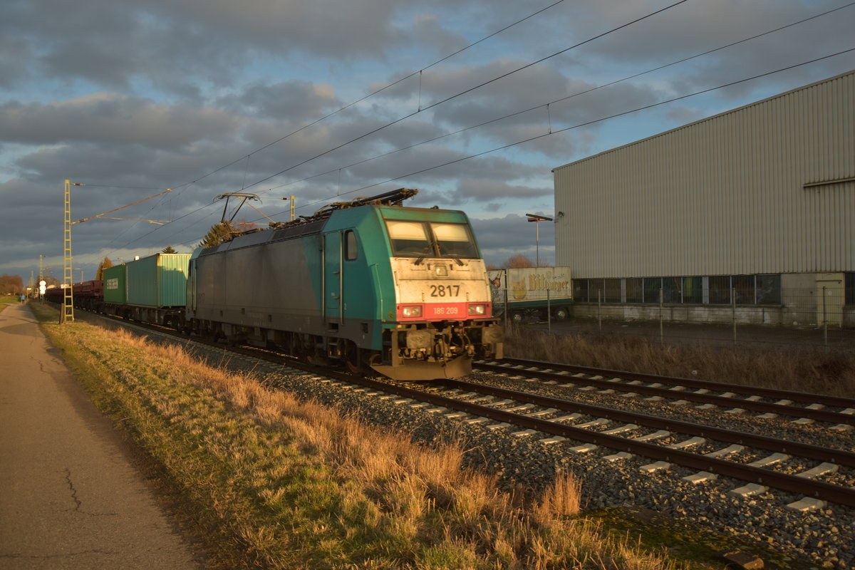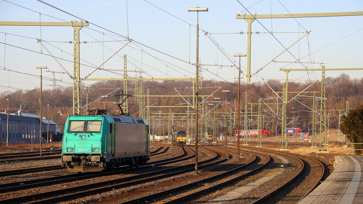Lok 185 595-6 durchfährt den Badischen Bahnhof. Das abzweigende Gleis führt auf einen Parkplatz, von wo aus auch diese Aufnahme am 18.01.2017 entstand.