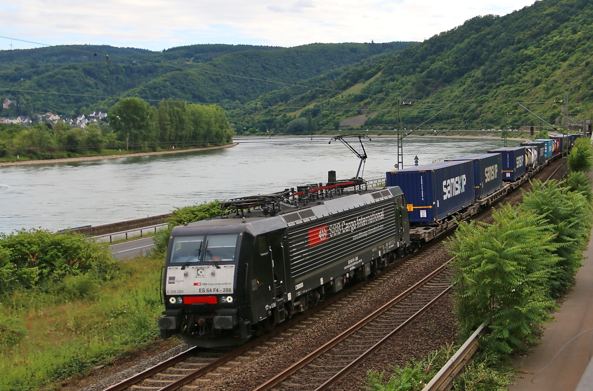 Ein schwarzer Dispo-Stier kam am 30. August 2015 auch noch mit einer interessanten Leistung in Hermannspiegel durch: ES 64 U2 072 fährt aktuell für TXL und hatte einen Ganzzug, gebildet aus H-Wagen der FS, am Haken. Der Zug dürfte leer gewesen sein und ging zurück nach Italien, um dort mit Mineralwasser beladen zu werden.