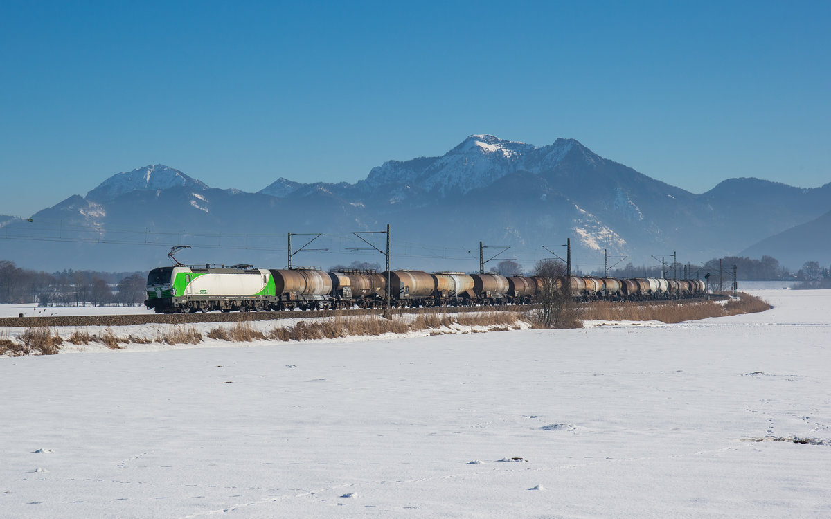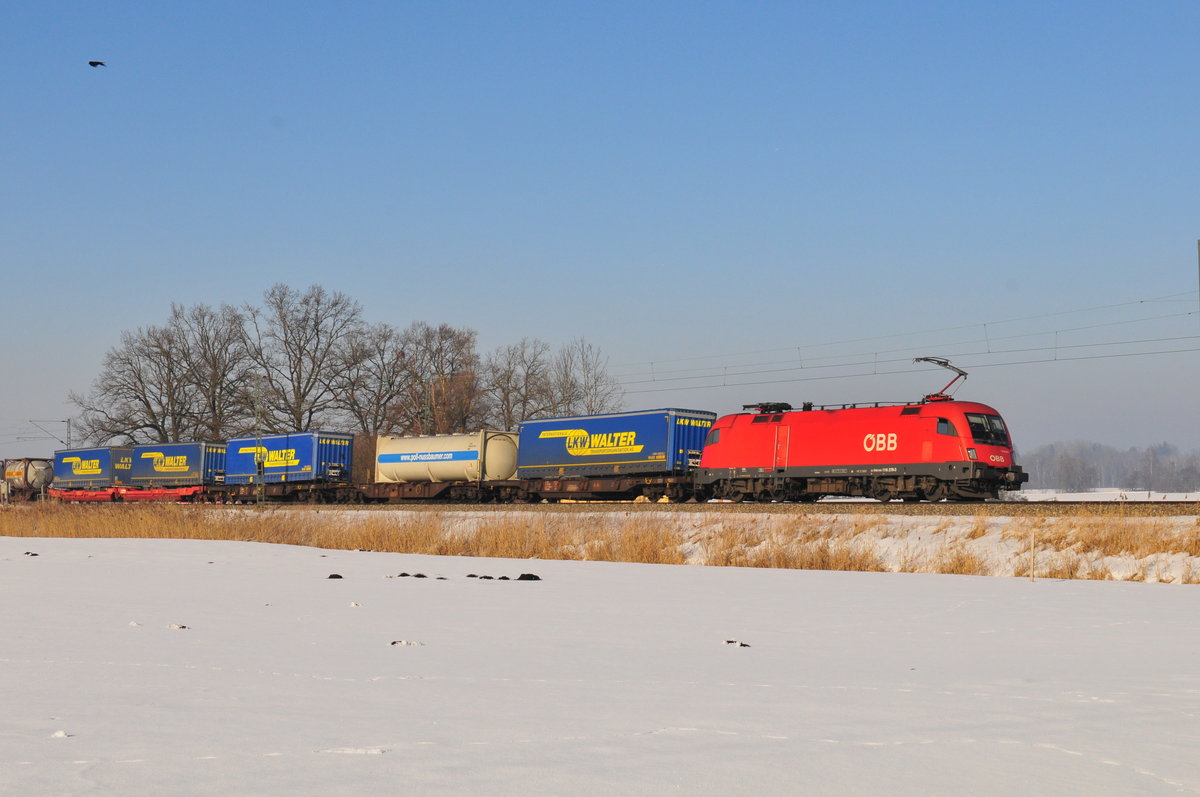 Die 1116 278-3 der ÖBB vor einem Güterzug in Richtung Salzburg bei Weisham in der Nähe von Prien am Chiemsee am 28.01.17