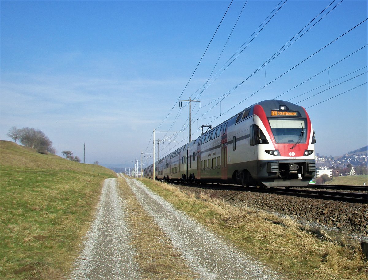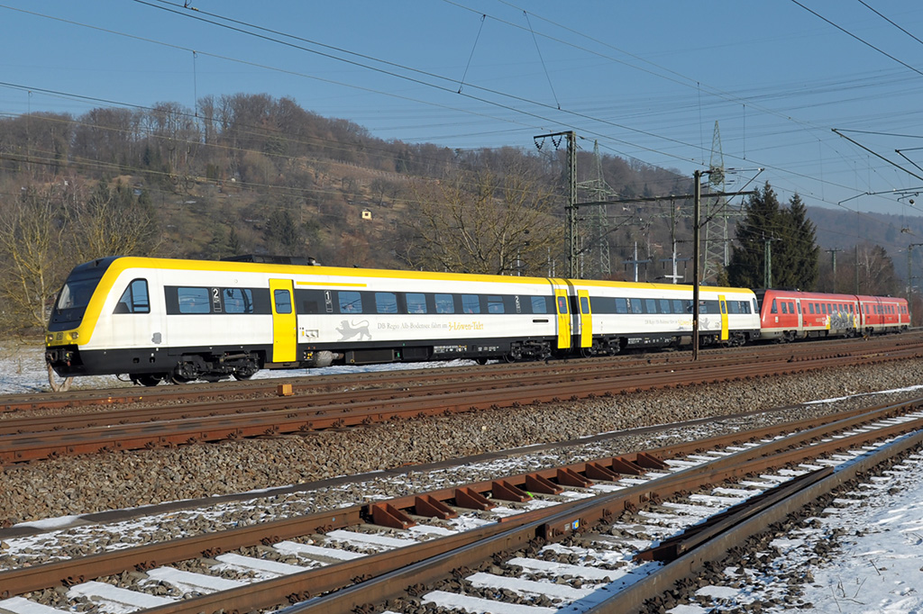 Überlagerungen - Mitzieher/Bewegungsunschärfe, Sonnenlicht/Schatten und auch die Türen der beiden Bahnen überlagern sich. Das schon Mal gezeigte Bild wurde hier enger geschnitten und der von Olli angeregte stärkere Kontrast wurde übernommen. S-Bahn-Begegnung zwischen den Stationen Fellbach und Sommerrain. 21.01.2017 (M)