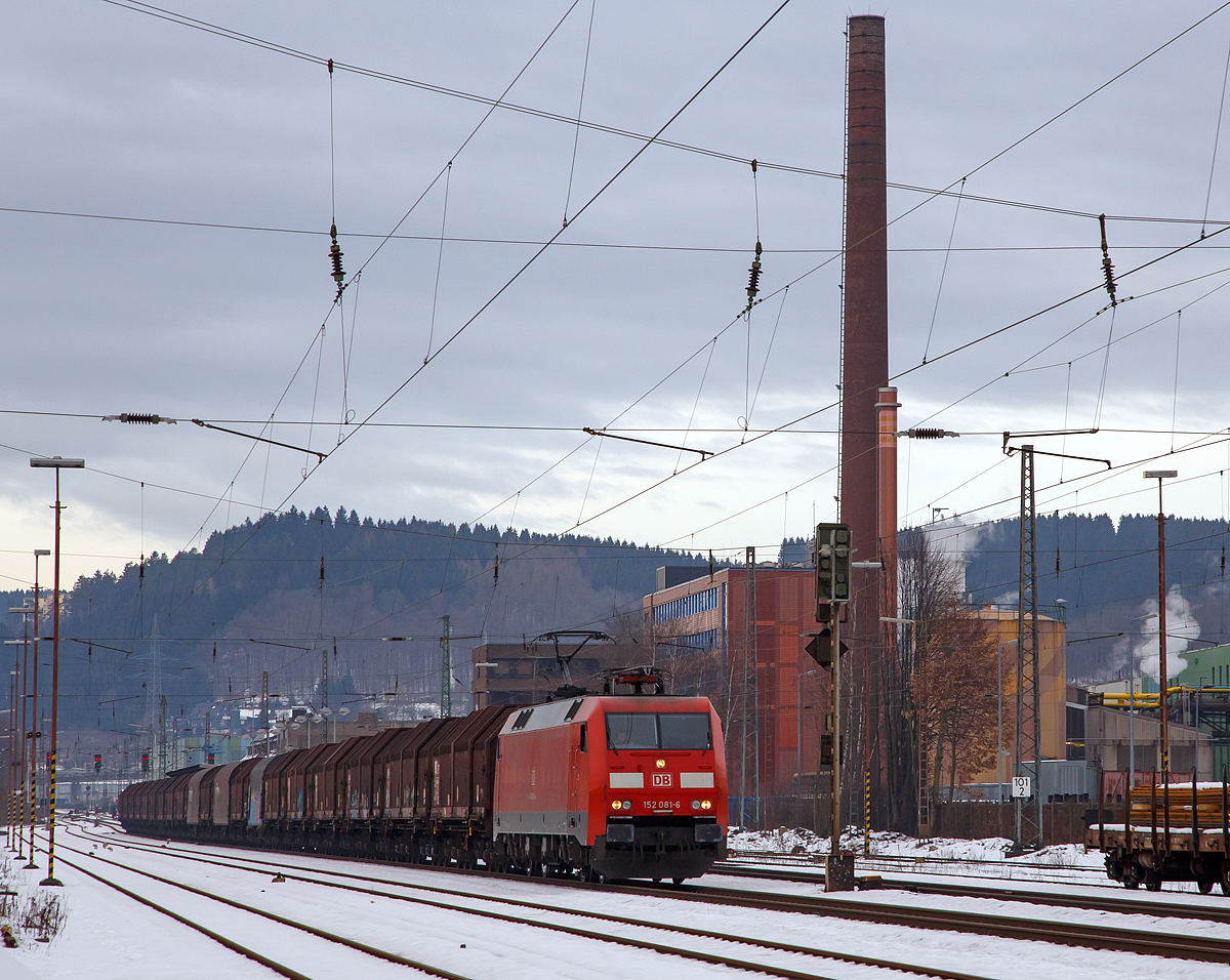 Die 152 081-6 (91 80 6152 081-6 D-DB) der DB Cargo Deutschland AG fährt am 28.01.2017 mit eine Coil-Güterzug (6-achsigen Drehgestellflachwagen der Gattung Sahimms 900 bzw. Sahimms-u 901) durch Siegen-Geisweid in Richtung Süden (wahrscheinlich war das Ziel Dillenburg).
