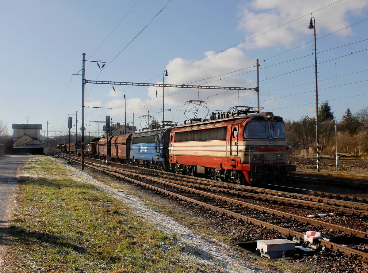 Die 230 055 und die 230 069 mit einem Güterzug am 03.12.2016 bei der Durchfahrt in Ševětín.