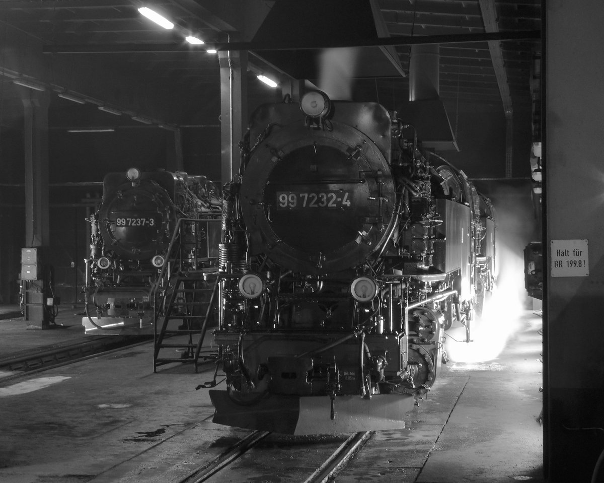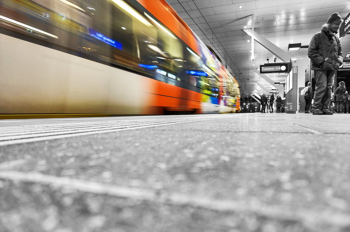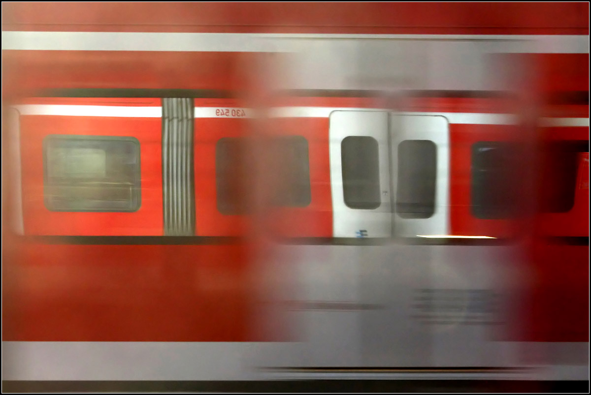 Mitzieher/Bewegungsunschärfe, Sonnenlicht/Schatten und auch die Türen der beiden Bahnen überlagern sich. Das schon Mal gezeigte Bild wurde hier enger geschnitten und der von Olli angeregte stärkere Kontrast wurde übernommen.