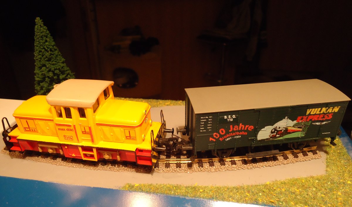 FLEISCHMANN/ROCO-MODELLBAHN-GESPANN IN HO Fleischmann-HO-Rangierlok V42/O$K,umlackiert als Werklok,und ROCO-Güterwagen "Vulkan-Express",am 29.1.2017.....