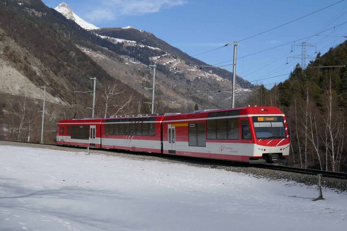 Regio von Göschenen nach Visp mit der Deh 4/4 II 96  Münster  in der Mitte, am 29.1.17 bei Bitsch.