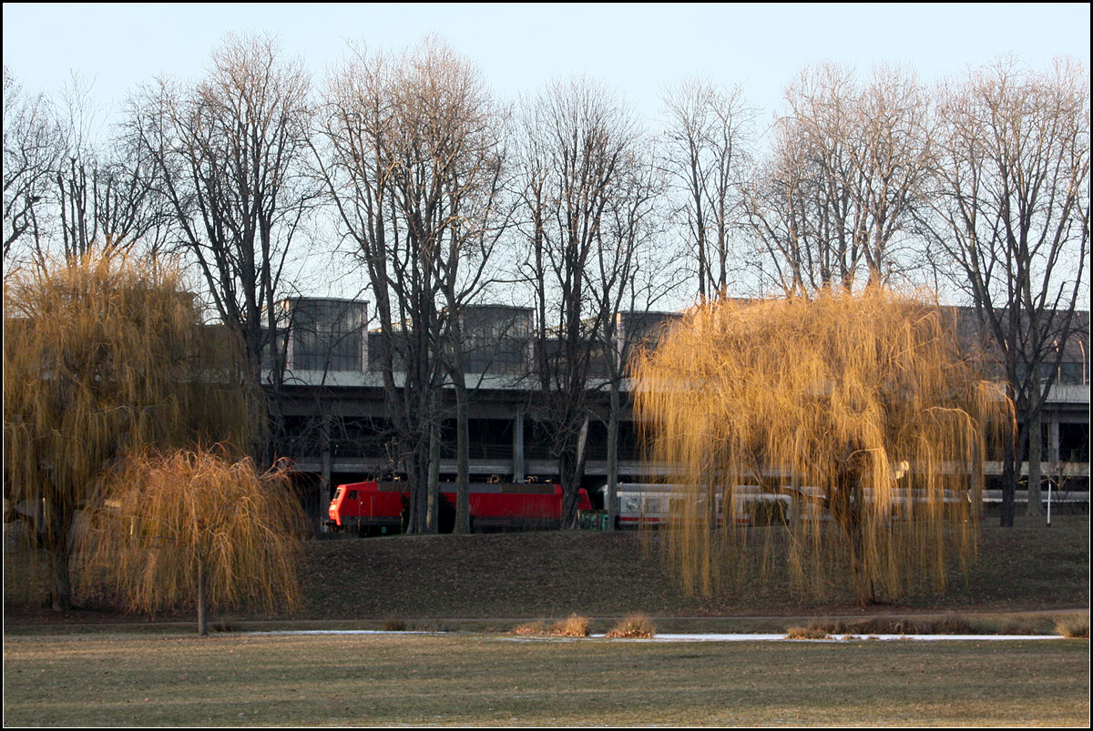 Die Front der Lok und einzelne Bäume werden noch von der schon tiefstehenden Sonne erreicht. Spätnachmittag-Stimmung im Unteren Schlossgarten in Stuttgart. Im Bild die hintere Lok eines beidseitig bespannten IC-Zuges.