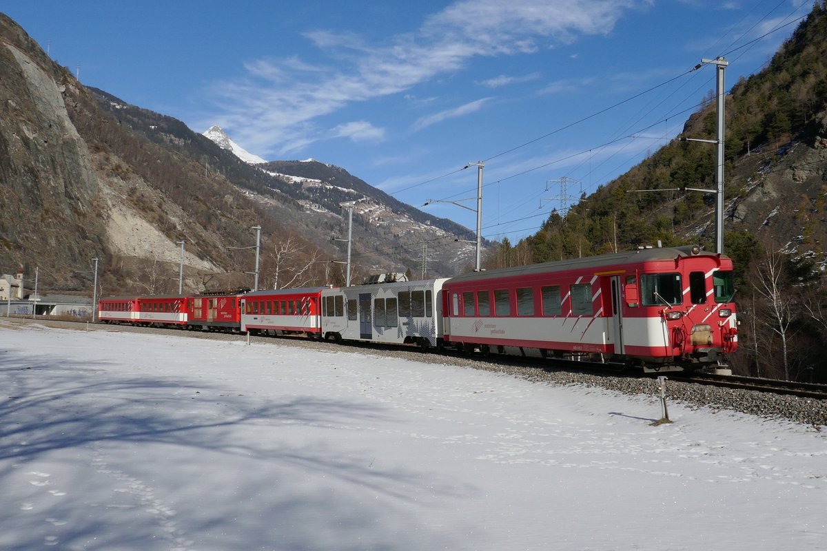 Regio von Göschenen nach Visp mit der Deh 4/4 II 96 "Münster" in der Mitte, am 29.1.17 bei Bitsch.