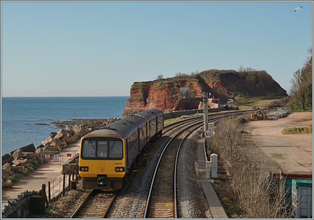 Zwei Class 143 Triebzüge auf dem Weg nach Paignton verlassen den Bahnhof Dawlish Warren.