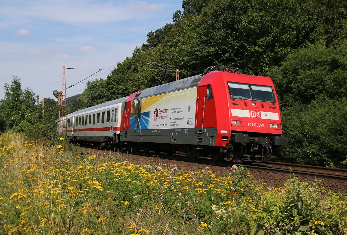 101 037-0 bespannte am 01.08.2015 einen Umleiter-IC aus Richtung Göttingen kommend. Aufgenommen zwischen Friedland(HAN) und Eichenberg.