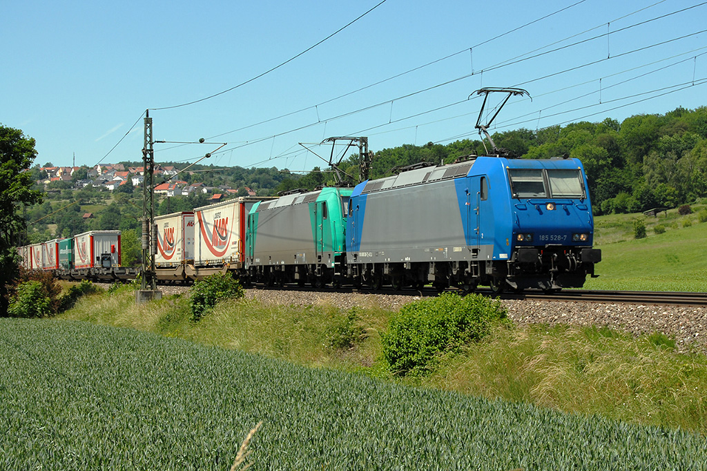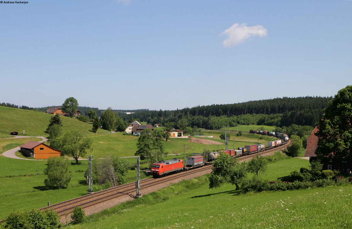 185 290-4 ist mit einen gemischten Güterzug bei Reilos am 08.06.2017 unterwegs.