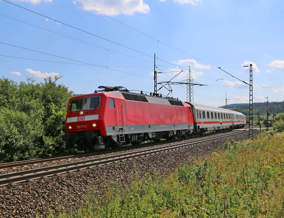 120 138-3 zieht einen Umleiter-IC in Richtung Göttingen. Aufgenommen zwischen Eichenberg und Friedland(HAN) am 01.08.2015.