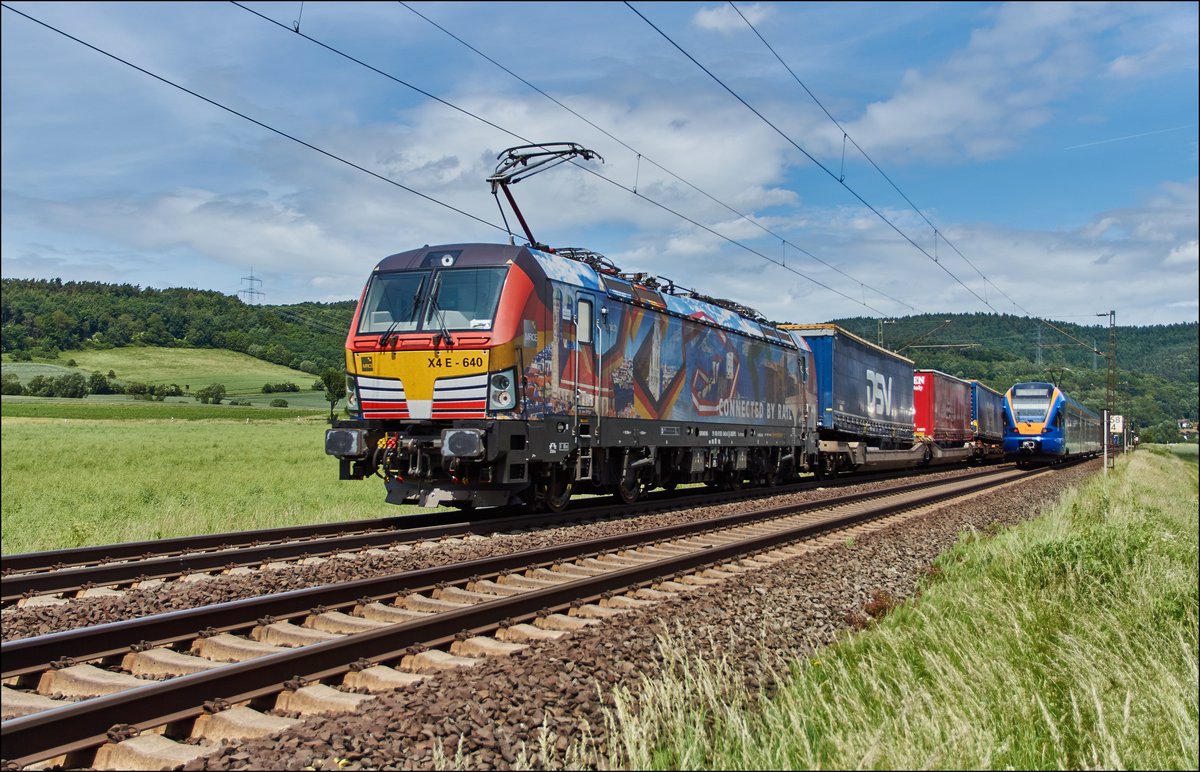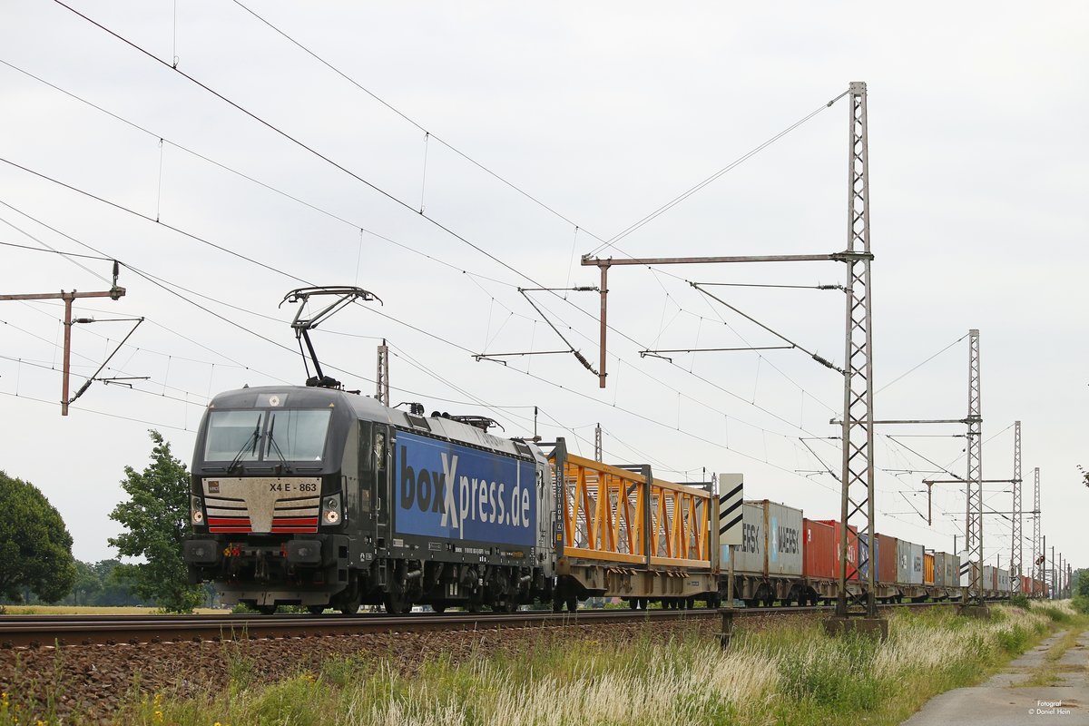 X4E -640 von MRCE ist mit einen Aufliegerzug bei Reilos am 08.06.2017 zu sehen.