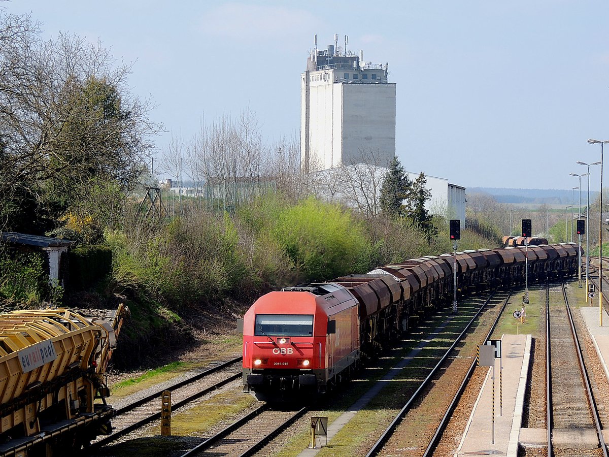 2016 076-9 erreicht von Schärding kommend, mit dem rd. 1000Tonnen schweren Schotterzug den Bhf. Ried; 170408