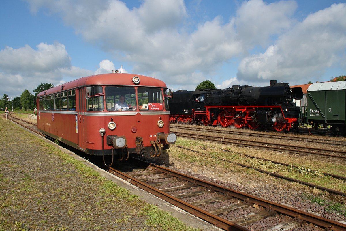 798 610-1 trifft am 10.6.2017 in Pritzwalk auf 35 1097-1. Beide Fahrzeuge waren an diesem Tag als Sonderleistungen anlässlich des Bahnhoffests rund um Pritzwalk unterwegs.