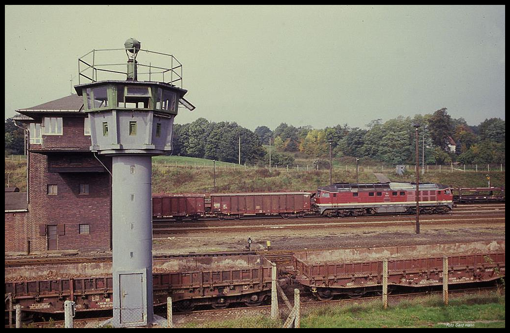 Am 3.10.1990 standen zum Teil noch die alten Grenz Wachtürme der DDR. Dieser hier steht im Bahnhof Gerstungen, wo gerade eine unbekannte 132zig mit einem Güterzug verkehrt.