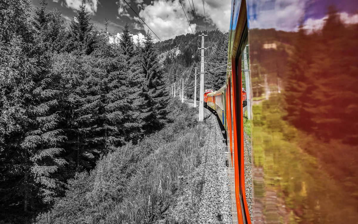 Der MOB ABDe 8/8 4004  Fribourg  unterwegs von Montreux nach Chernex kurz vor Châtelard VD. Im Hintergrund rechts im Bild die  Dents de Midi , übersetzt die  Zähne des Mittags  und somit eine Erklärung weshalb bei diesem um die Mittageszeit aufgenommen Foto nur S/W in Frage kam.