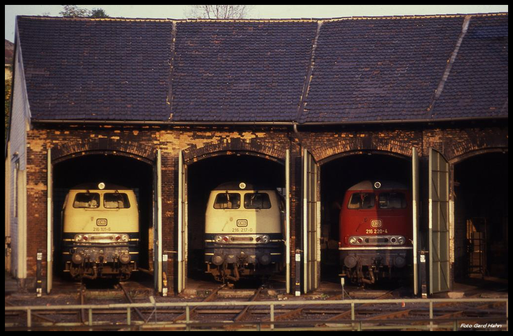 BW Bebra am 3.10.1990: Gleich drei Dieselloks der Reihe 216 geben sich im Rundschuppen ein Stelldichein: von links sehen wir 216101, 216217 und die altrote 216220.