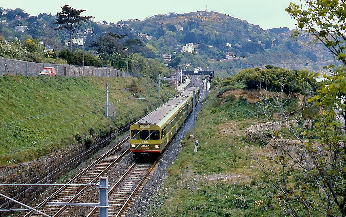 Der für den elektrischen Vorortverkehr von Howth nach Bray bei Linke-Hoffmann-Busch beschaffte Triebwagen 8322 der DART (Dublin Area Rapid Transport) verlässt im April 1992 Killiney in Richtung Bray