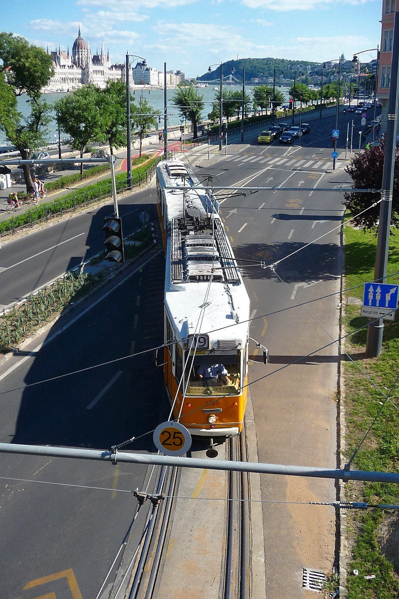 Wer genau hinschaut, entdeckt den Zebrastreifen für Straßenbahnen: Hier quert die Linie 19 die Straße, um am Donau-Ufer weiter zu fahren. Budapest, 7.8.16