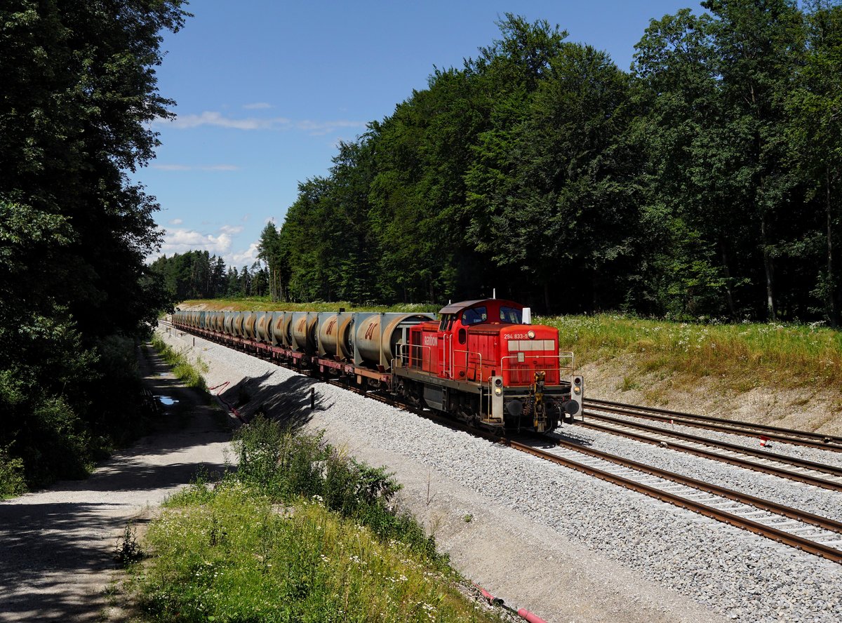 Die 294 833 mit einem Müllzug am 30.06.2017 bei der Einfahrt in Tüßling.