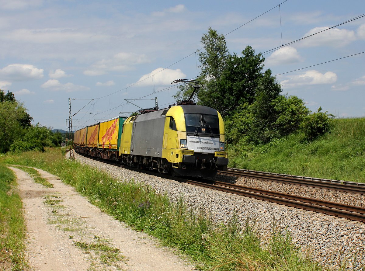 Die ES 64 U2-095 mit einem KLV-Zug am 23.06.2012 unterwegs bei Ostermünchen.