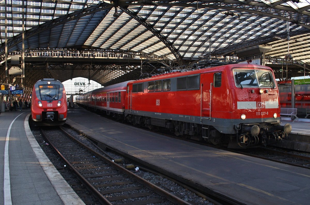 Mein 6000. Bild zeigt den HVZ-Verstärker des RE8 "Rhein-Erft-Express" welcher von Montag bis Freitag zwischen Köln Messe/Deutz und Kaldenkirchen verkehrt. Gefahren wird diese Leistung auch im Jahr 2017 immer noch mit n-Wagen und einem Steuerwagen der Bauart Karlsruhe. So auch am 4.7.2017 als der RE10838 in den Kölner Hauptbahnhof einfährt. Schublok für diese Leistung war an jenem Tag die Dortmunder 111 037-8.